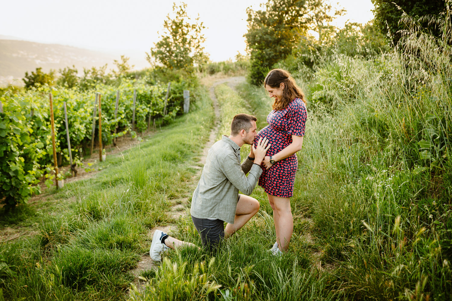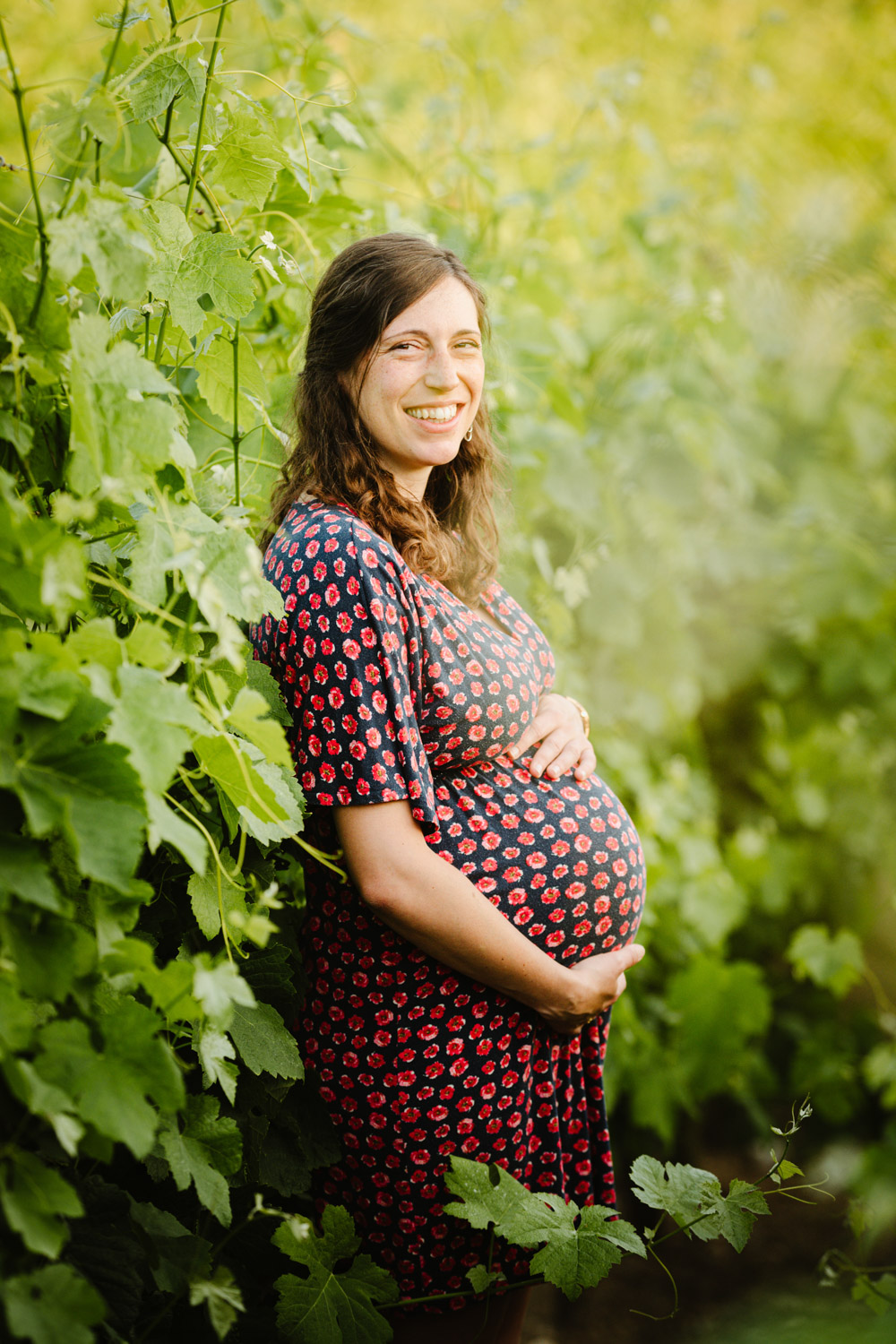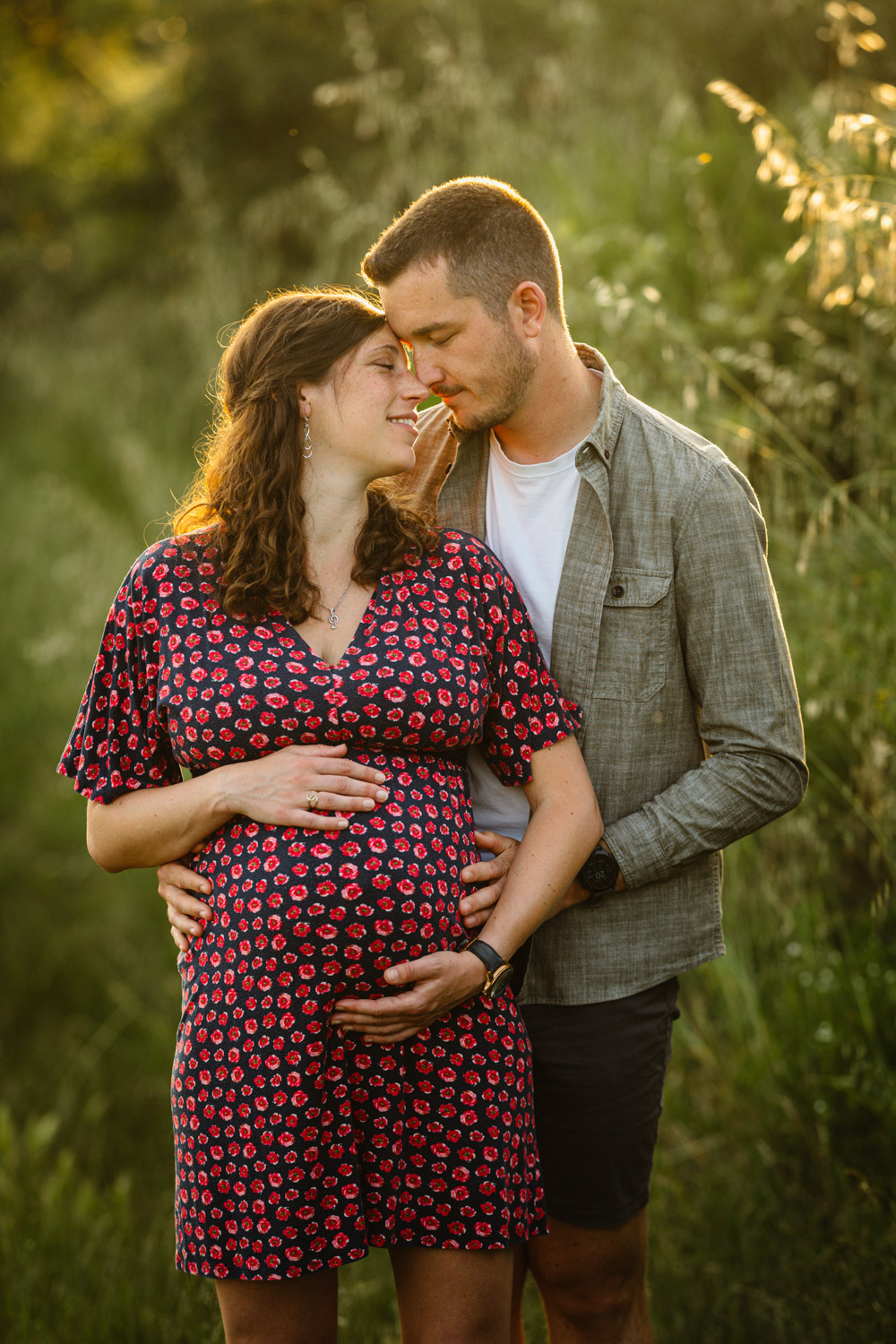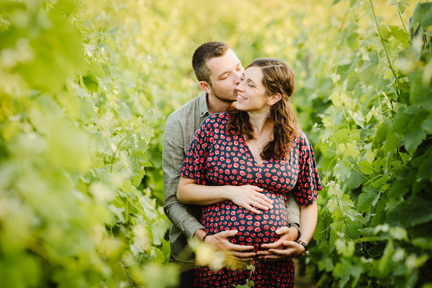 Comme vous pourrez le remarquer, nos chers futurs parents mignons tout plein ont bénéficié d’un cadre incroyable au milieu des vignes, tout en étant bercés par une lumière douce et magnifique : c’est la fameuse lumière de l’heure dorée en fin de journée, également appelée « golden hour » en anglais. J’affectionne tellement cette lumière et ses reflets. C’est précisément pour cette raison que je préconise toujours de faire votre séance d’été en fin de journée et croyez-moi, vous ne le regretterez pas !