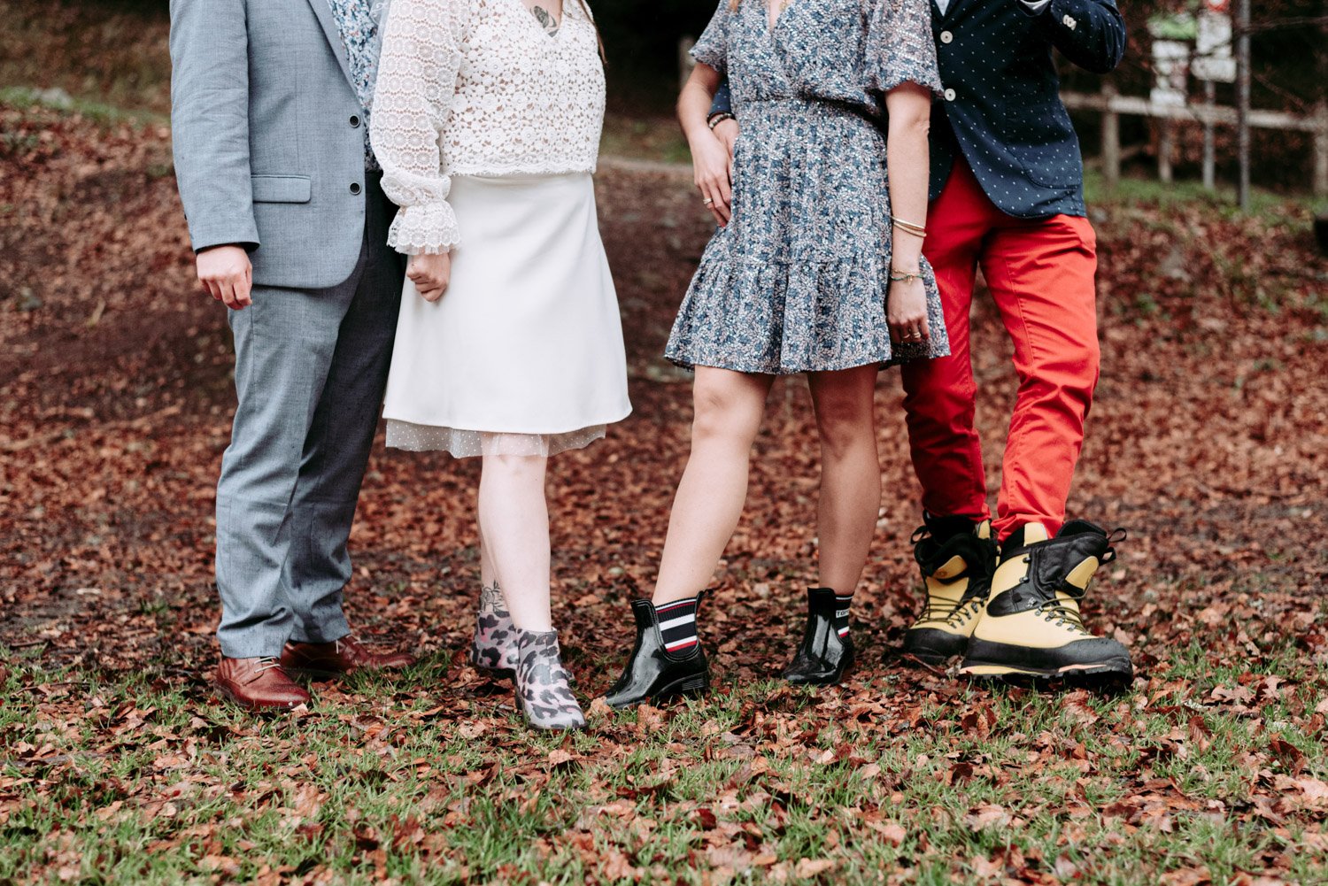 Marcher dans l’herbe humide en escarpins n’est confortable pour personne. Une paire de bottes – éventuellement dans les couleurs de votre mariage – peut devenir un clin d’œil visuel. Pensez aussi à préparer des chaussures de rechange sèches pour la soirée afin que votre robe ou votre pantalon restent le plus possible à l’abri des éclaboussures.